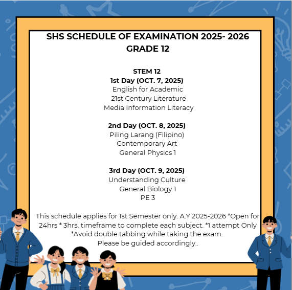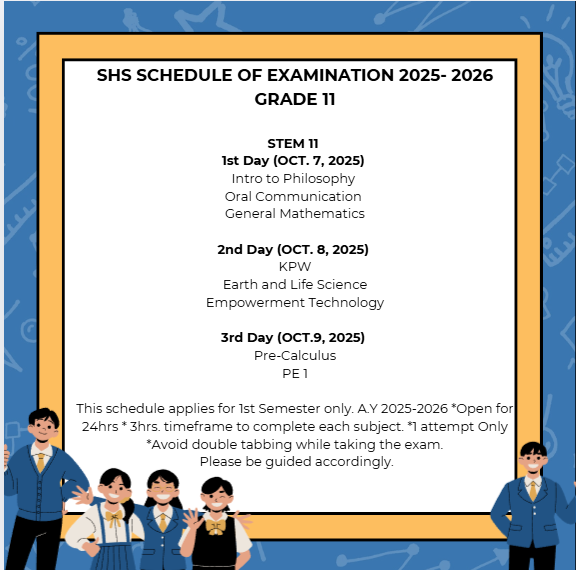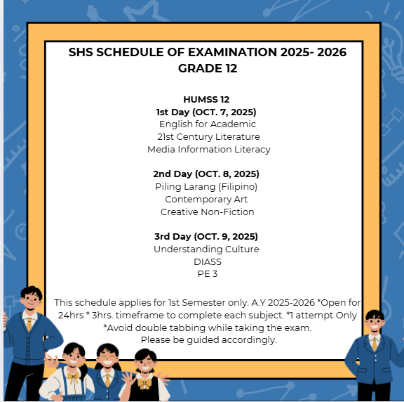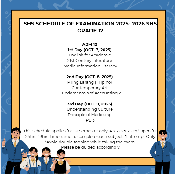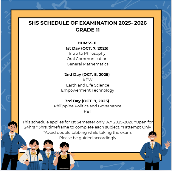 2ND QUARTERLY EXAMINATION SCHEDULE by Jefster Valdez - Monday, 6 October 2025, 10:28 AM Number of replies: 0 Permalink