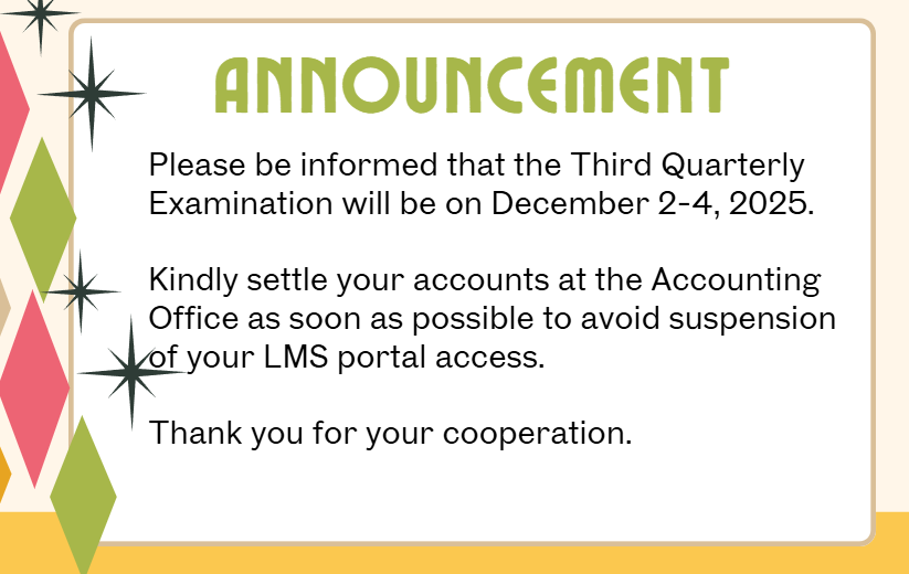 ANNOUNCEMENT!!! by Jefster Valdez - Tuesday, 25 November 2025, 7:25 AM Number of replies: 0 Permalink