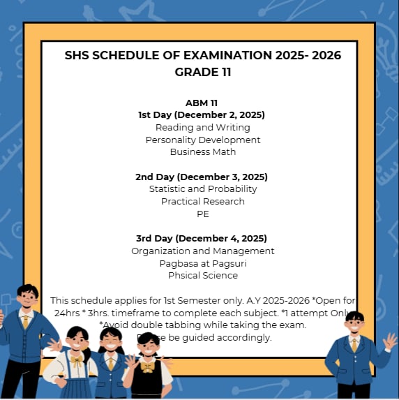 3RD QUARTER EXAMINATION SCHEDULE by Jefster Valdez - Wednesday, 26 November 2025, 11:29 AM Number of replies: 0 Permalink